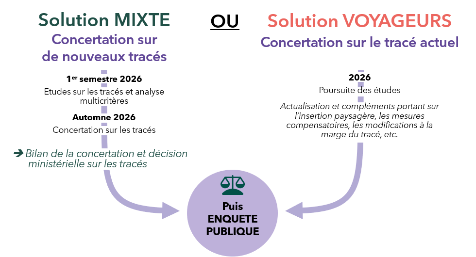 En fonction des résultats de la concertation menée en 2025 et de la décision qui sera prise sur les fonctionnalités à l’issue de cette étape, SNCF Réseau envisage :